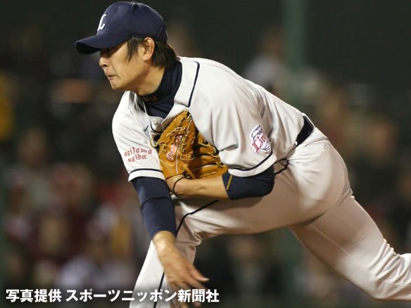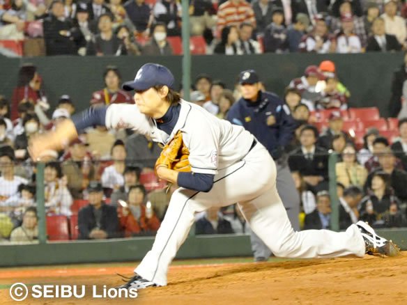 涌井は援護をもらった直後をきっちり3者凡退に封じ、イーグルスにつけいる隙を与えず! 試合の流れは完全にライオンズにある! |