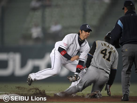 ▼4番 スレッジ 2-1からの4球目を投げる直前、1塁ランナーの稲葉がスタート。しかし涌井は落ち着いて2塁へ送球し、悠々タッチアウト! 盗塁失敗。 |