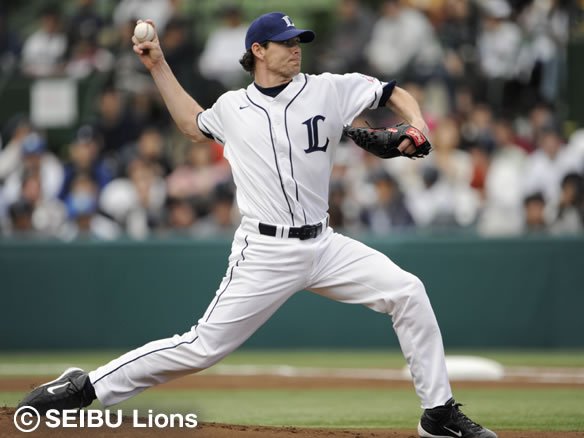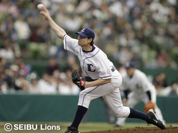 投手 スウィーニー 6番 G.G.佐藤 見三振 2-2からアウトコース低めの変化球を自信を持って見送ったが、判定はストライク・・・。 |