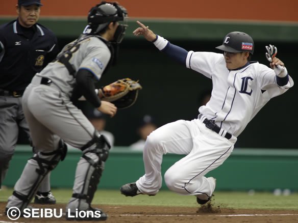 栗山が勢いあるスライディングで2点目のホームイン!!
