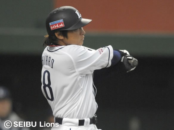 6番 平尾 左安 1-0からのインコース高めのストレートを振り切り、ライナーでレフトへ運んだ! 1塁ランナー・G.G.佐藤は2塁ストップ。 |