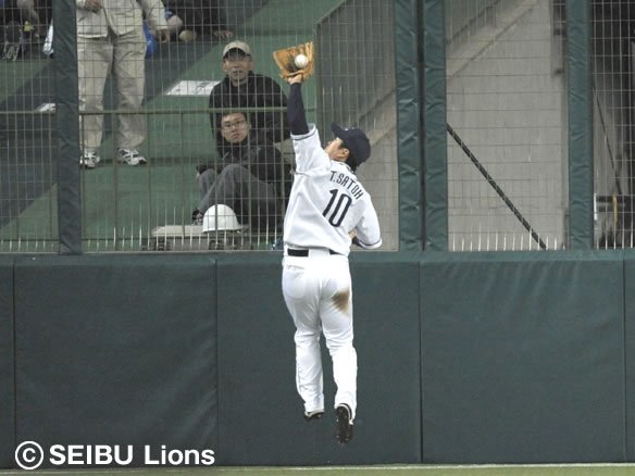 9番 今江 中飛 2-1から弾き返された打球はセンター後方を襲う大きな当たり。しかしセンター・佐藤が背走していってジャンピングキャッチ! すぐに振り向いて内野へ返球し、飛び出していた1塁ランナーの福浦を刺そうとしたが、間一髪セーフ。 |