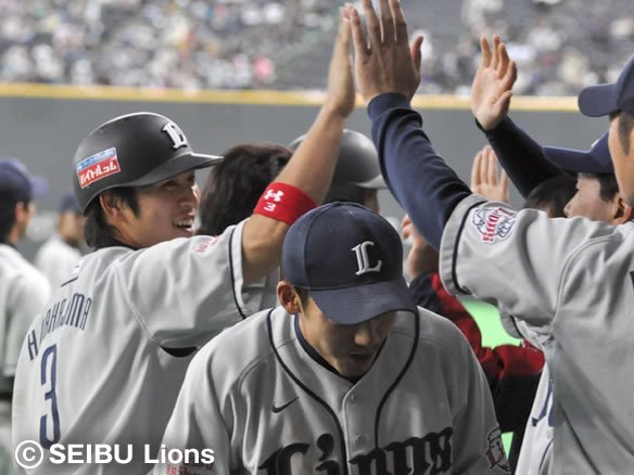 中村、清水の2者連続2ベースでダルビッシュから1点を先制しました! このリードを何としても守りきり、涌井に同級生対決初白星を! |