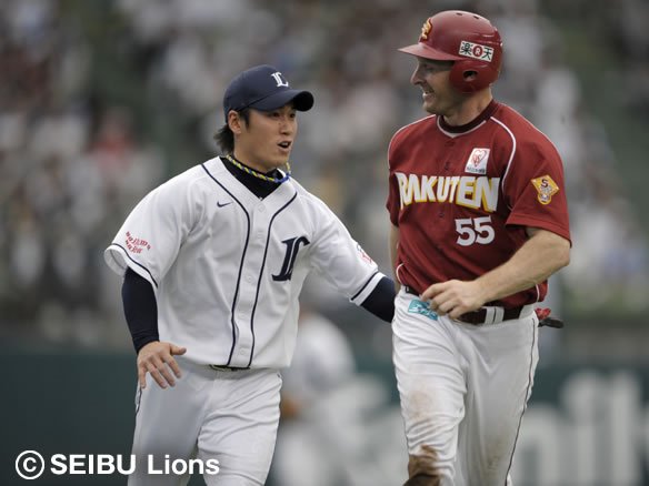 投手 木谷 5番 G.G.佐藤 投ゴ 2-1からの変化球を打ち損じてしまい、ピッチャー・木谷がワンバウンドの打球をジャンプしておさえ、1塁へ送球。 |