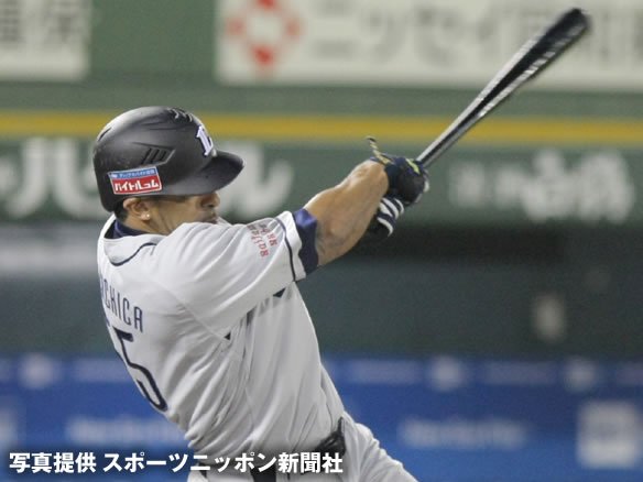 6番 G.G.佐藤 遊併 2-0から高めのストレートを打ち損じてしまった。ショート・大引に素早く処理され、6-4-3とスムーズに渡ってしまい、ダブルプレー・・・。 |