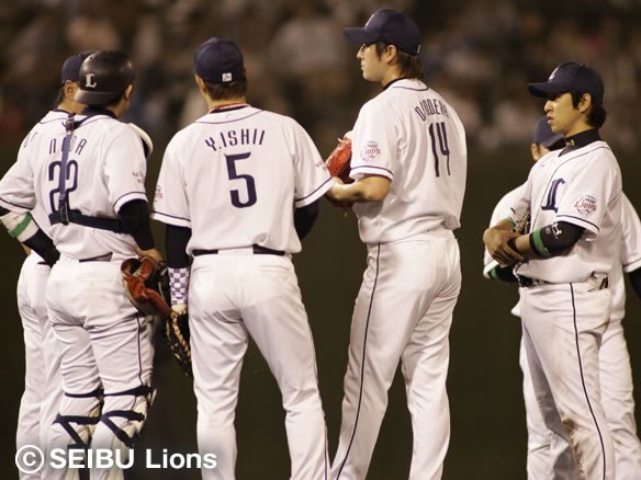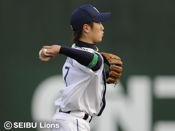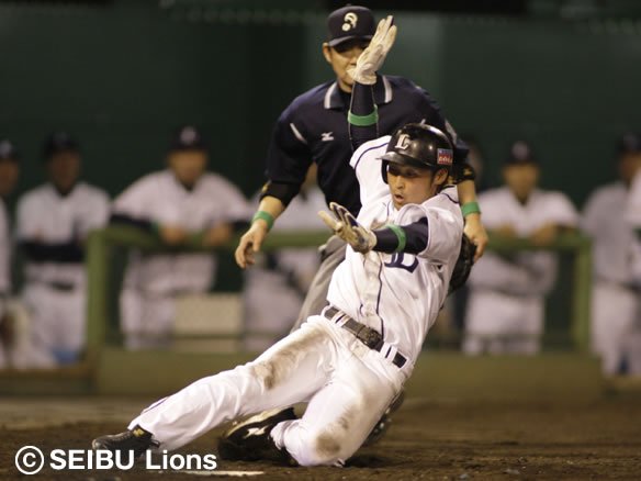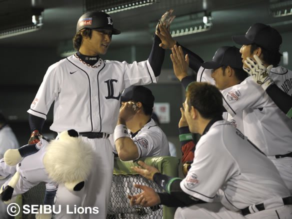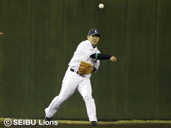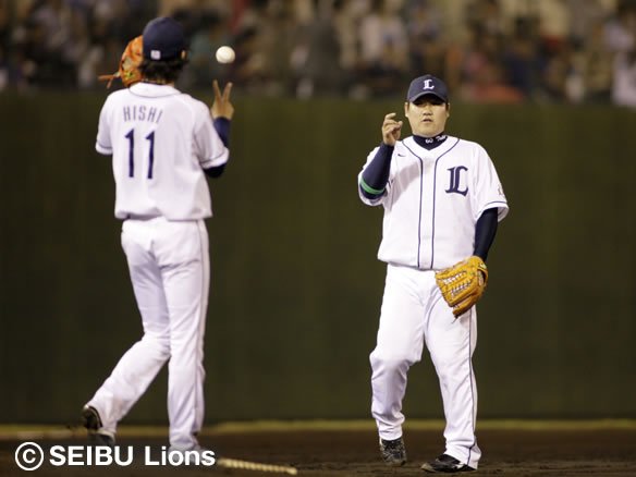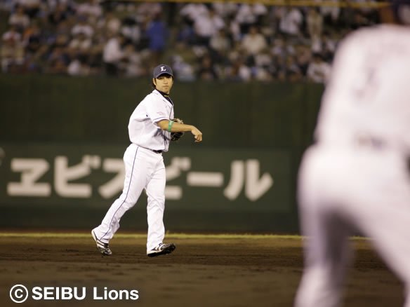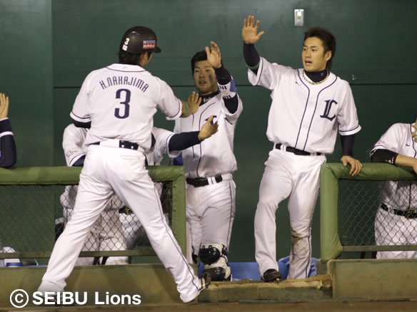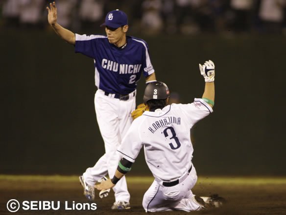 先頭の中島がヒットで出塁し、ワイルドピッチも絡んで追加点のチャンスを作りましたが、G.G.佐藤の放った当たりは相手の好守に阻まれてしまい得点には至らず。勝利を確実なものとするためにも、さらに得点を奪ってドラゴンズを突き放したいところです。 |