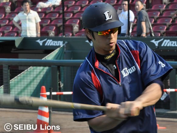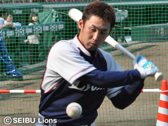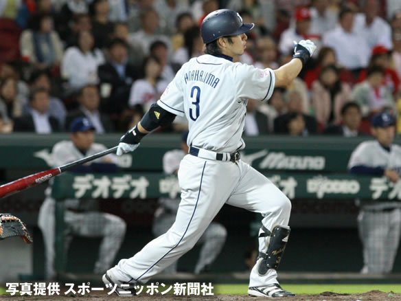 6番 G.G.佐藤 中飛 1-2からアウトコースのスライダーにバットの先で合わせたが、センター・赤松に左中間寄りでおさえられた。 |