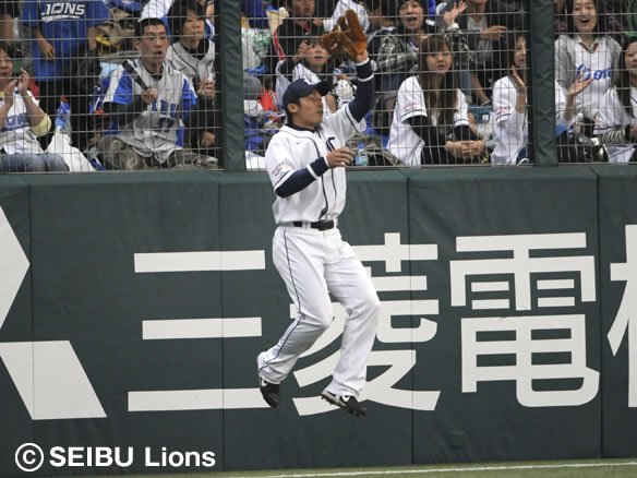 レフト・栗山がフェンス際の当たりをジャンピングキャッチ!