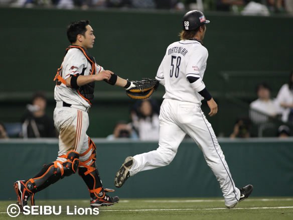 先頭のラミレスに不運な当たりの内野安打を許しはしたものの、きっちりと後続を打ち取って追加点を許さず! 帆足の力投に打線が応え、一気に逆転といきたい! |