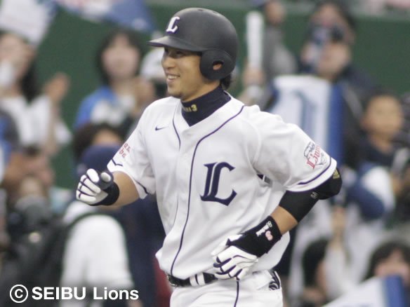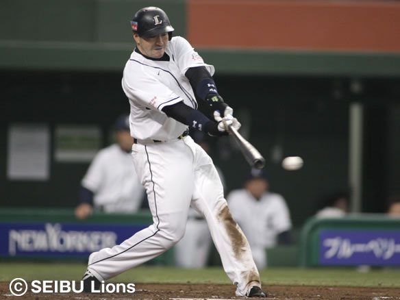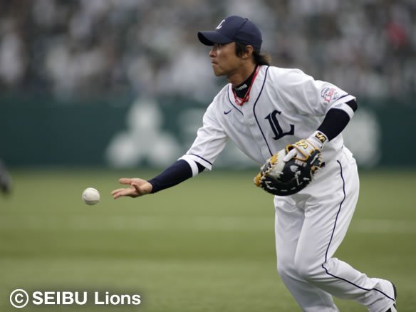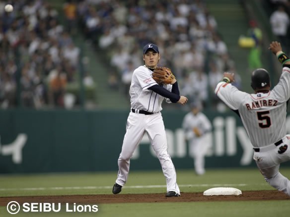 投手 帆足 4番 ラミレス 遊安 1-1から低めのボールを弾き返され、打球は二遊間へ。ショート・中島がダイビングキャッチでおさえ、膝をついたまま1塁へ送球したが、一歩及ばずセーフ。記録は内野安打。 |