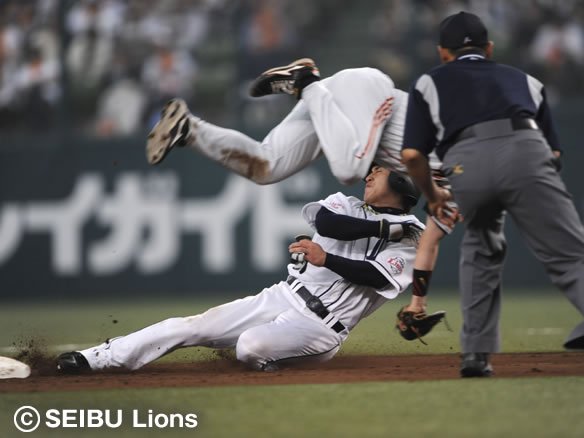 2番 栗山 一ゴ 1-1からの変化球を打ち損じてしまい、ファースト・李承ヨプにおさえられた。李承ヨプから1塁ベースカバーのピッチャー・内海にボールが渡り、アウト。 |