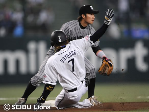 3番 新井 一ゴ 2-2からの7球目、アウトコースのボールを叩きつけられたが、ファースト・平尾が少し後ろに下がっておさえ、1塁ベースカバーのピッチャー・涌井に送球。この間に1塁ランナーの赤星、2塁ランナーの平野がそれぞれ進塁。 |