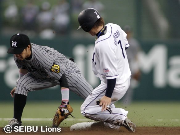 7番 平尾 二ゴ失 初球からバントの構えを見せていたが、1-1からバスターエンドランを敢行! 平尾の叩いた打球はセカンド・関本の前に転がったが関本はこれを弾いてしまい、さらに走ってきた1塁ランナーのG.G.佐藤と激突。これが走塁妨害と認められ、G.G.佐藤は2塁進塁。記録は関本のエラーと走塁妨害。 |