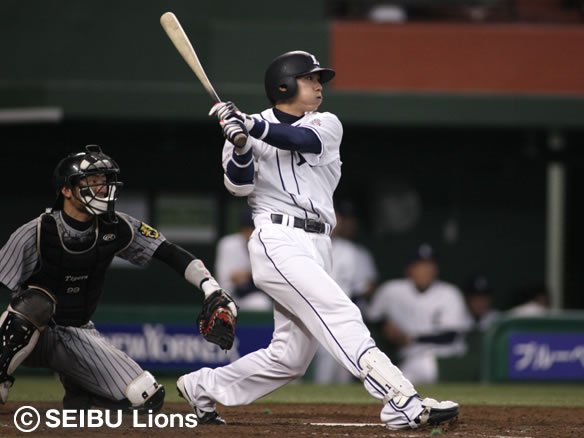 6番 G.G.佐藤 左安 1-1から真ん中に入ったフォークを叩き、三遊間の真ん中を破った! |