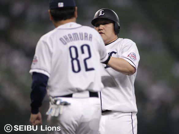 6番 G.G.佐藤 四球 カウント0-2からのボールがワンバウンドとなり、キャッチャー・狩野が止めようとしたがその股を抜けて後ろへ転がっていった。この間に3塁ランナーの中島がホームインし、6対3。1塁ランナーの中村も2塁へ! 記録はピッチャー・阿部のワイルドピッチ。 |