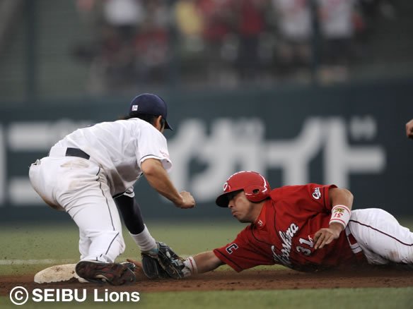 5番 石井 カウント0-1からピッチャー・前田健が2塁へ牽制。飛び出していた2塁ランナーの中島は戻れず、二三塁間に挟まれてしまった。最後は2塁上でタッチアウト。 |