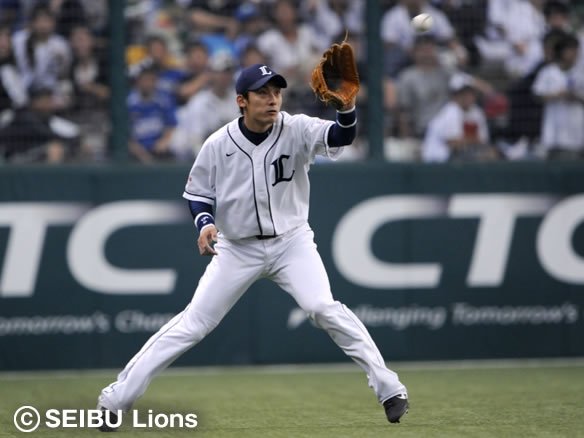 6番 G.G.佐藤 二飛 0-1から大きく打ち上げてしまい、バックしていったセカンド・東出に正面を向いておさえられた。 |
