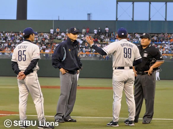 5番 G.G.佐藤 二ゴ 初球、インコース高めのボールを思い切り引っ張った打球は痛烈なライナーとなって3塁線へ! しかしサード・古城のグラブにファールライン上の際どいところで当たった打球は、フェアではなくファールの判定。これに渡辺監督が抗議し、しばらく試合が中断。 |