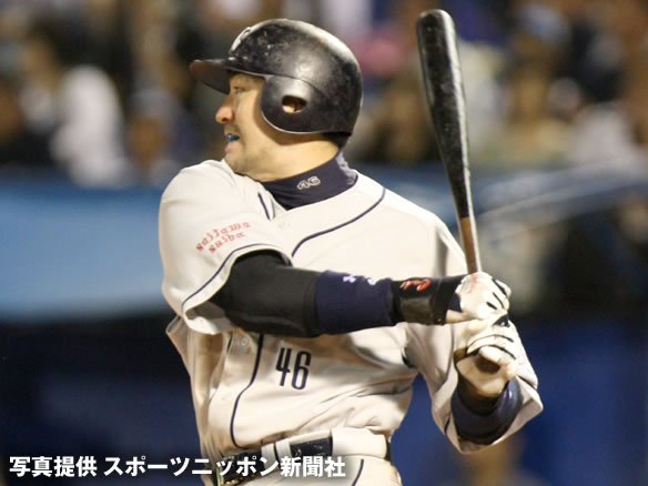 6番 G.G.佐藤 右安 0-1からアウトコースのストレートを流し打ち、ライトへのクリーンヒット! |