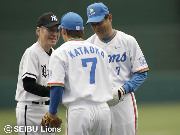 ライオンズ・クラシック2009開幕セレモニーで豊田氏・石毛氏と片岡が握手を交わす