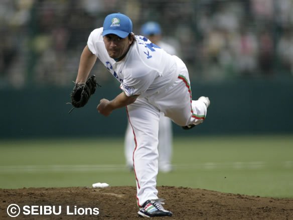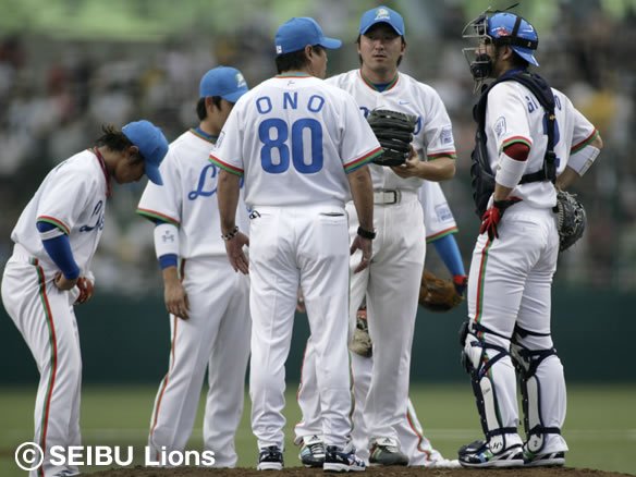投手 石井一 多村の5号ソロと田上の犠牲フライで2点を先制されてしまいましたが、数々の修羅場をくぐり抜けてきたライオンズにとっては十分逆転できる範囲内! すかさず反撃を見せ、一気に同点、逆転といきたい! |