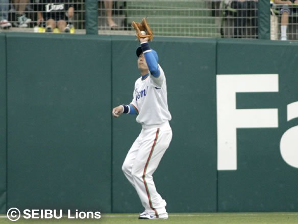 2番 栗山 右飛 フルカウントから低めの変化球を振り抜いたが、背走していったライト・多村にフェンス手前でおさえられてしまった。 |