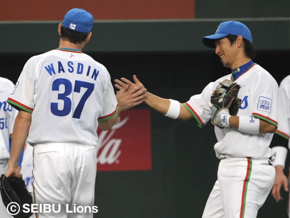 3回までテンポの良い投球を続けてきたワズディンでしたが、この回はリズムを乱して多村、松田にタイムリーを許し、同点に追いつかれてしまいました。しかし、打線がすぐさま勝ち越し点を奪い、ワズディンを盛り立てていきたいところです! |