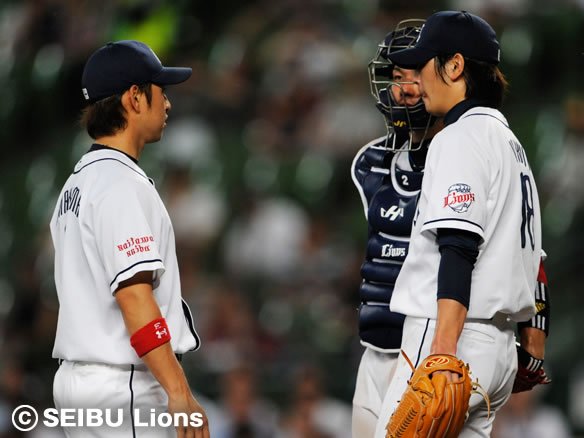 小野投手コーチがここでマウンドに向かい、内野陣も集まって涌井に一呼吸入れます。 |
