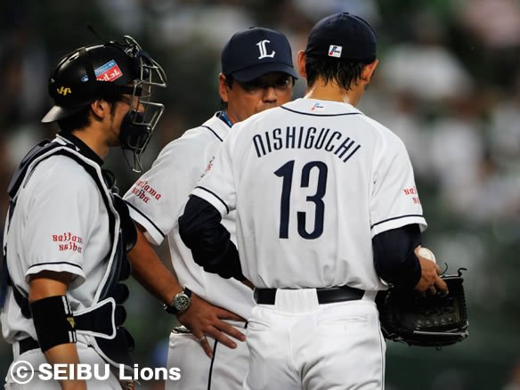 ここで小野投手コーチがマウンドに向かい、西口に声をかけます。 |