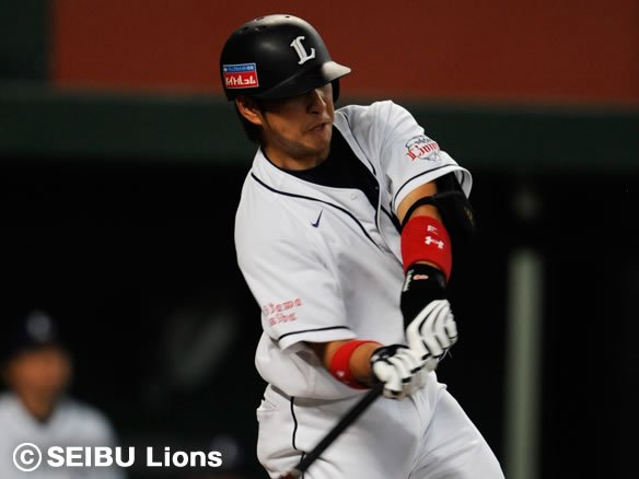 6番 G.G.佐藤 右飛 初球のアウトコースのストレートを鮮やかな流し打ちで弾き返したが、ライト・平石のほぼ正面へ飛んでしまった。 |