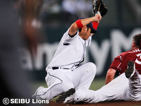 投手 西口 6番 セギノール 一ゴ 2-2から低めのボールを痛烈に引っ張られたが、ファースト・江藤が1塁後方の1塁線際ギリギリのところでガッチリとおさえ、1塁ベースカバーのピッチャー・西口を制して自らベースを踏み、アウト。 |