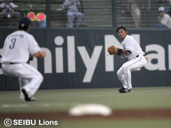 投手 涌井 4番 カブレラ 右飛 2-2からインコースのストレートで詰まらせ、ライト・G.G.佐藤がゆっくりと落下点に入ってキャッチ。 |