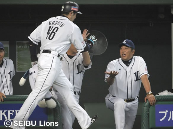 ホームランを放ったG.G.佐藤が渡辺監督とタッチを交わす