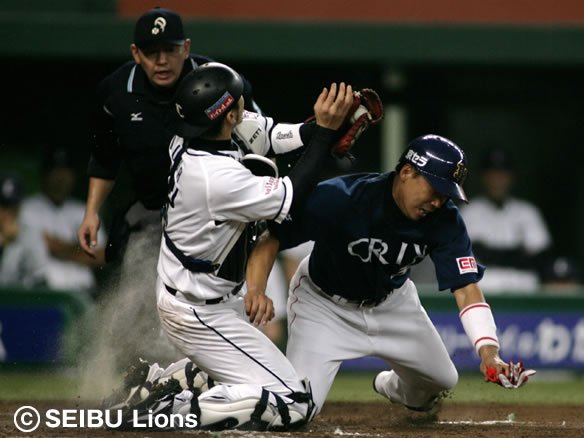 7番 山崎 一バゴ 0-1からスクイズを敢行され、1塁線側に転がされてしまった。しかし前進してきたファースト・石井義がそのままの勢いで1塁へ送球し、キャッチャー・野田の体を張ったブロックで3塁ランナー・下山のホームインを阻止し、タッチアウト! スクイズ失敗!! |
