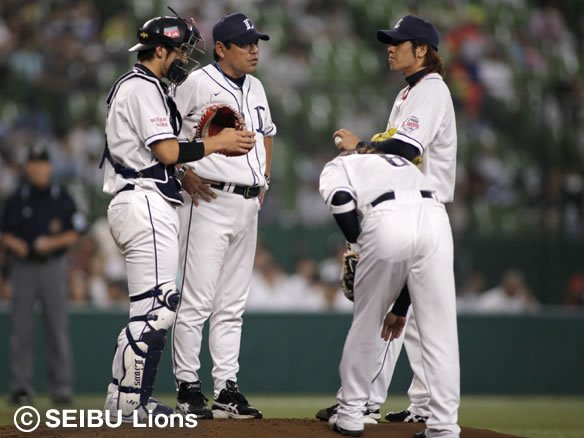 ここで一度小野投球コーチがマウンドへ向かい、帆足に声をかけます。 |