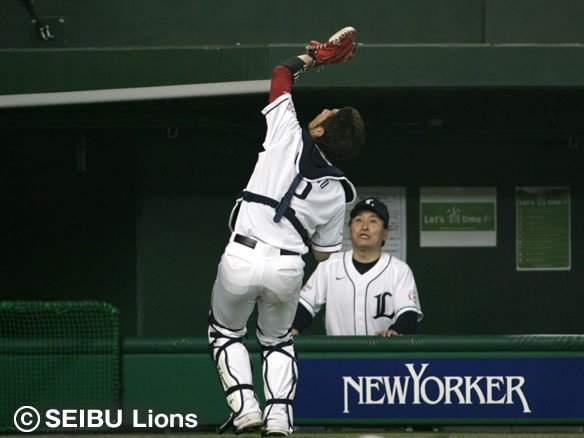 銀仁朗が3塁ベンチ前で高々と上がったフライをキャッチ