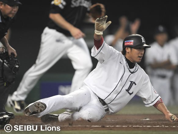 8番 炭谷 左中二 2-1からの高めのストレートを思い切りよく引っぱたき、打球は左中間を真っ二つに破っていった! 1塁ランナー・G.G.佐藤が懸命の送球で3塁を蹴ってホームへ滑り込み、10対1! 打った銀仁朗も2塁へ! ライオンズ、7月3日以来の2ケタ得点達成! ![]() 10