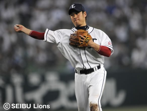3番 中島 ピッチャーライナー 1-2からの低めのストレートをたたいたが、ピッチャー返しのライナーをピッチャー・柳瀬にジャンピングキャッチでグラブにおさめられた。飛び出していた2塁ランナー・栗山を見てすぐに2塁へ送球されたが、この送球が逸れてセンターへと転がっていった! この間に3塁ランナー・片岡がゆっくりとホームを踏み、9対1! 記録はピッチャーライナーと、柳瀬のエラー。 ![]() 9
