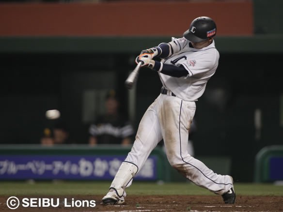 4番 明石 左越二 0-1からの低めのストレートを弾き返され、打球はレフト・佐藤の頭上を越えてフェンスに到達。2塁ランナー・川崎がホームへ生還し、10対2。1塁ランナーの松中も3塁へ進み、打った明石も2塁へ。 ![]() 10