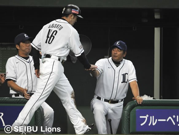 5番 後藤 左本 2-1からの5球目、インコースのストレートを思い切りの良いスイングで振り抜くと、打球はキレイなアーチを描いてライオンズファンの待つレフトスタンド上段に吸い込まれていった!! 後藤の今季第3号3ランが飛び出し、4対0! ライオンズ打線、初回から大爆発!! ![]() 4