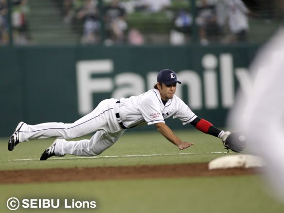 投手 野上 5番 多村 遊ゴ 1-0からアウトコースへのスライダーを打たせ、打球は二遊間への当たり。これをショート・中島がダイビングキャッチでおさえ、すぐに起き上がって1塁へ送球し、間一髪アウト! ファインプレー! |