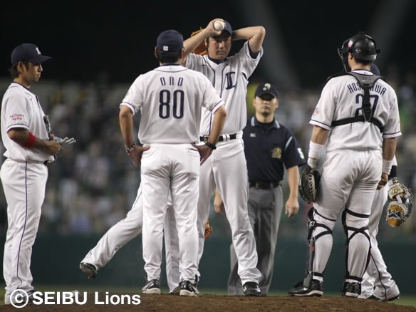 ここで小野投手コーチがマウンドへ向かい、野上に声をかけてリズムを整えます。 |
