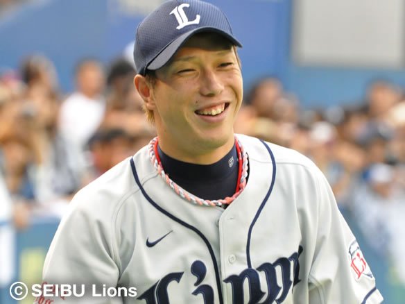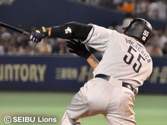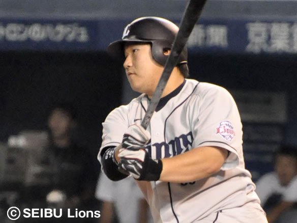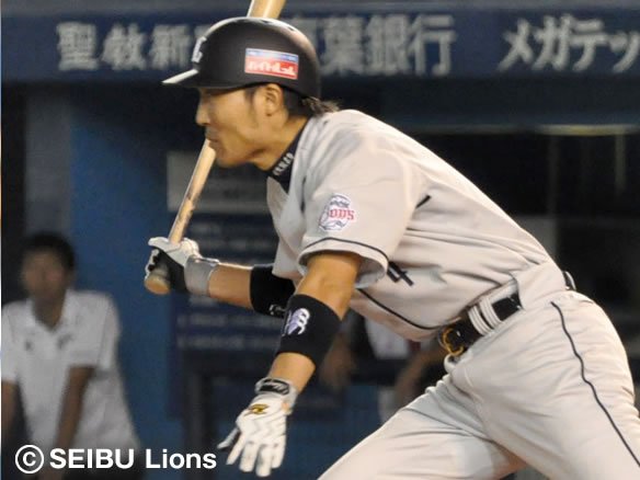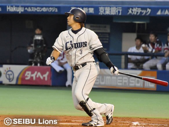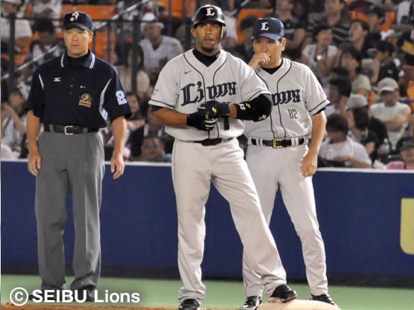 2番 栗山 右翼二 1-1からインコースのボールを思い切りよく引っぱたき、打球はダイビングキャッチを試みたファースト・バーナムJr.のグラブの先を抜けて1塁線を破ってライト線際を転がっていった!! 2塁ランナーの代走・赤田に続き、1塁ランナー・片岡も快足を飛ばして一気にホームへ生還し、5対3!! これぞ獅子の底力!! 勝利への執念!! 打った栗山は2塁へ! ![]() 3