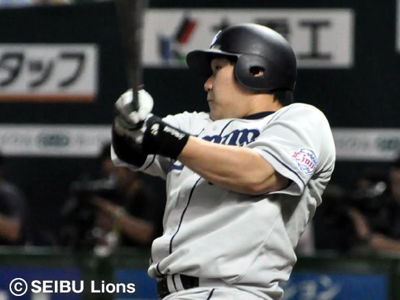 6番 G.G.佐藤 二ゴ 1-2からアウトコース寄りのボールをたたき、打球は一二塁間へ。抜けそうな当たりとなったが、セカンド・森本におさえられて1塁へ送球され、アウト。 |