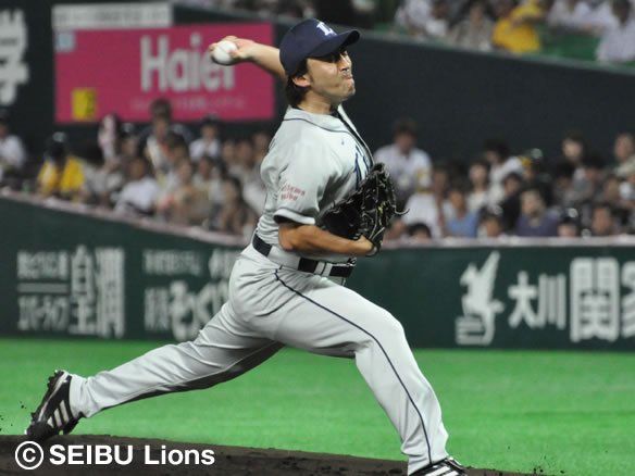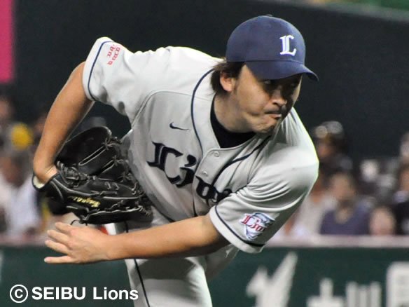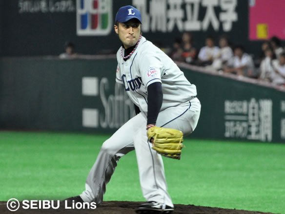 投手 石井一 ホークスのラッキー7の攻撃でしたが、2ケタ10個目の三振を奪うなどしてこの回も無得点に封じました! 試合の流れは完全にライオンズにありますが、残り2回の攻撃で一気にホークスを突き放してしまいましょう! |