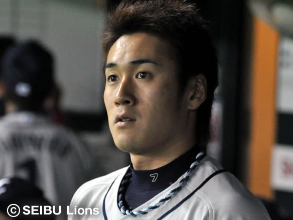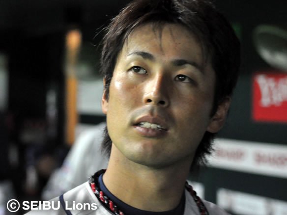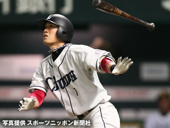 投手 藤岡 6番 G.G.佐藤 四球 フルカウントからの8球目、アウトコースへのスライダーにギリギリのところでバットを止めた! |