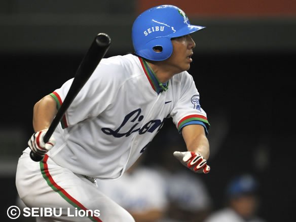 6番 G.G.佐藤 右安 1-1からのストレートを鋭く振り抜き、痛烈な当たりが一二塁間を破っていった! 1塁ランナー・中島は2塁を蹴って一気に3塁へ! |