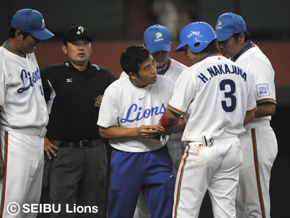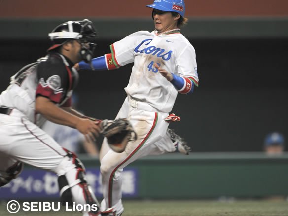 1点を追加され、なおも1死満塁とされましたが、ボカチカの素晴らしいバックホームで追加点を阻止しました!! 勢いはライオンズに傾いただけに、ここで一気に攻勢に出たい!! |