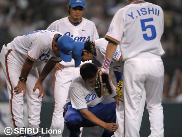 投手 岸 1番 西岡 投安 2-0からのカーブを弾き返され、ピッチャー・岸が正面でおさえようとしたが、打球が岸の右足すね付近に当たり、3塁線側に転がった。岸は素早くボールを拾い上げて1塁へ送球したが間に合わず。記録は内野安打。 |