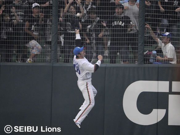 1番 西岡 右飛 初球を思い切り引っ張られ、打球はライト後方への大きな当たり。フェンスを直撃しようかという打球だったが、背走していったライト・G.G.佐藤がフェンスにぶつかりながらもジャンピングキャッチ! 超ファインプレー!! |